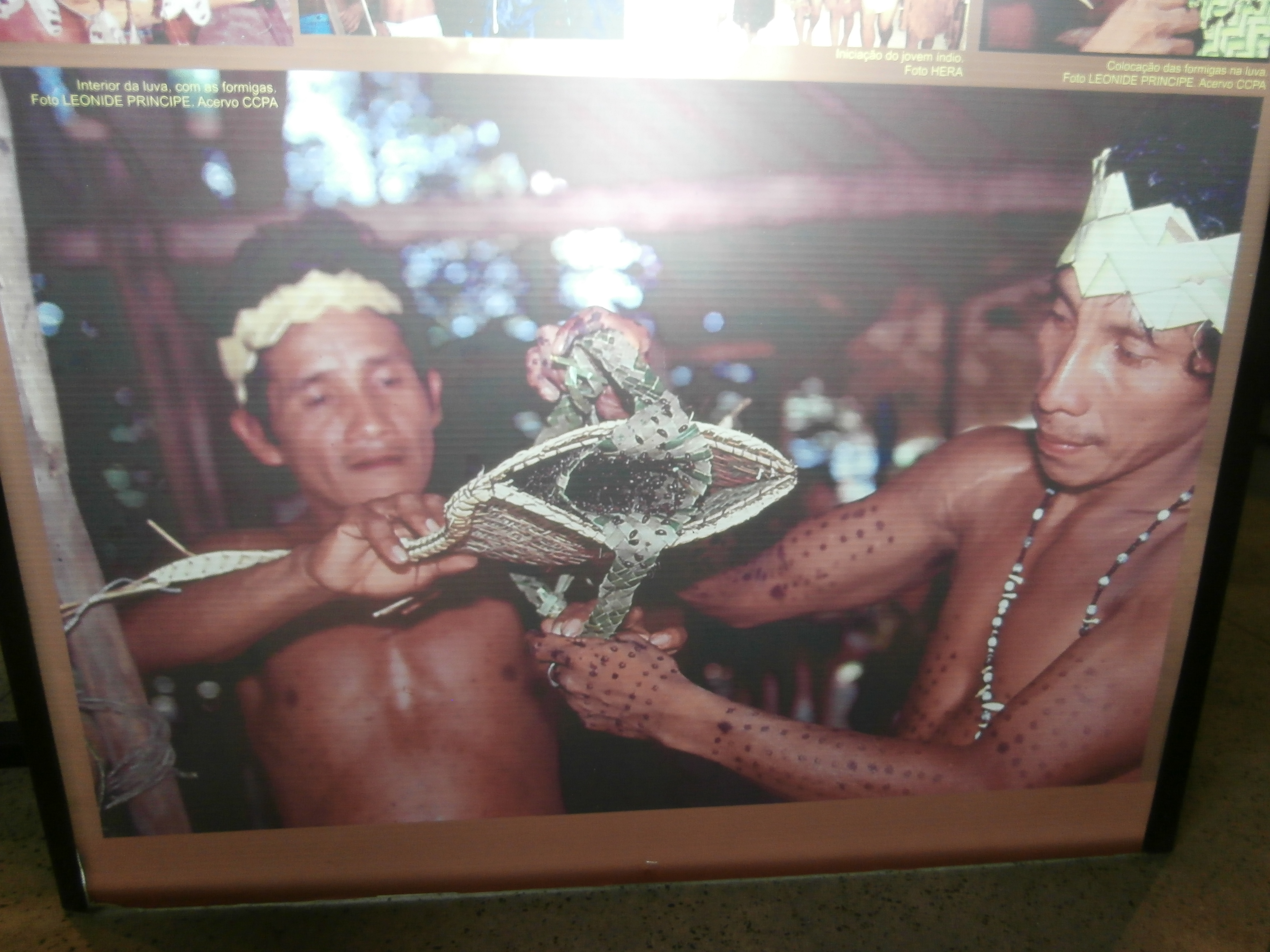 However, what really grabbed my attention was the Tucandeira Waty’Amá (‘Bullet Ant Adulthood’) ritual, a trial of strength and resistance to pain that the young Sataré Mawé male must pass before being accepted into the adult world and taking his place as a warrior, hunter and father within the tribe. This is no mean feat. Once the boy’s hand has been encased in the saaripé (a glove woven from straw and adorned with feathers) packed with tucandeira (‘bullet ants’), he must endure 15 minutes of agony as the tucandeira relentlessly sting his captive flesh while dancing and singing without any show of pain. If this were not enough, the boy must repeat the ritual until the tribe is satisfied that he has shown sufficient courage and strength to merit his place in the adult world.